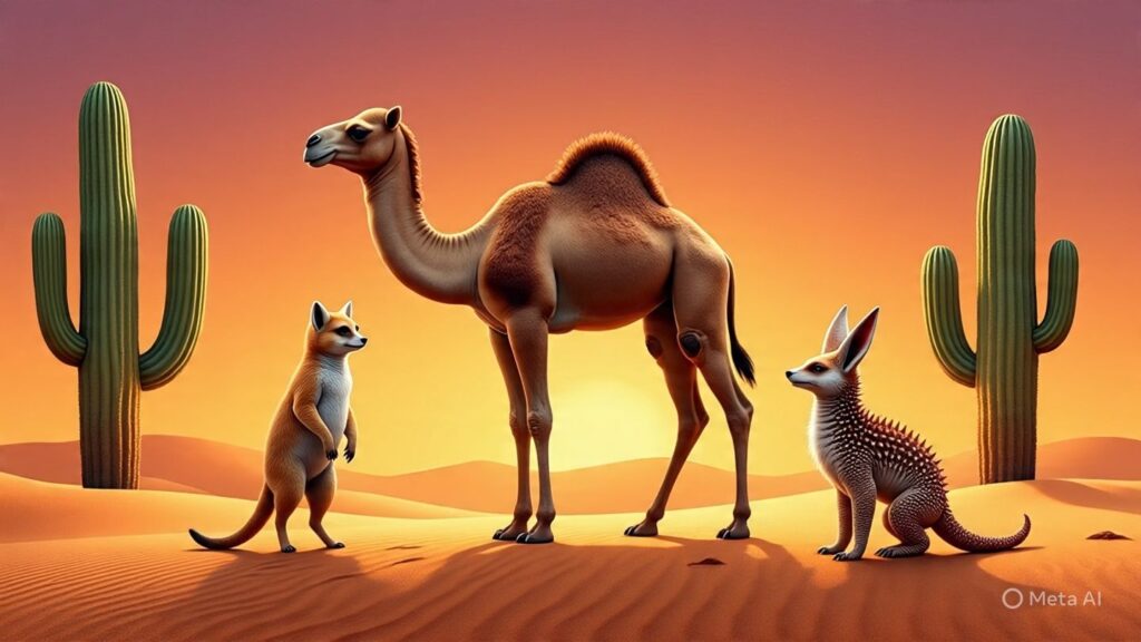 Camels are probably the most famous desert animals. Known as the ‘ships of the desert,’ camels have humps that store fat, not water! They can go for days without drinking and walk across hot sand without burning their feet, thanks to thick footpads. Their long eyelashes and nostrils protect them from blowing sand.