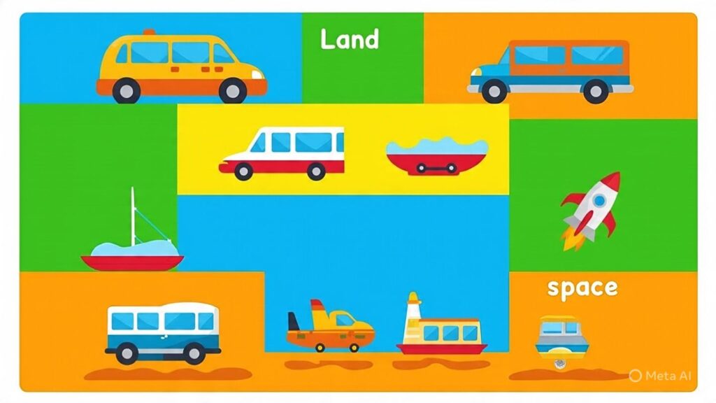 Land transport happens on roads or tracks. This includes cars, buses, bicycles, trucks, trains, and motorcycles. Trains are great for long-distance travel, while bicycles are fun and eco-friendly!