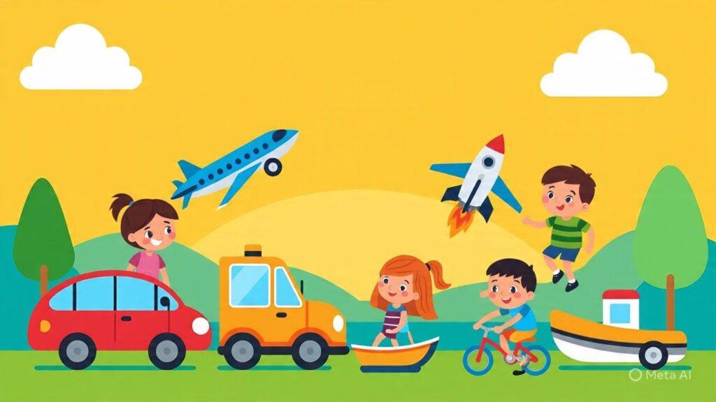 Transportation means how people and things move from one place to another. There are many ways we travel—by land, water, and air. Let’s explore these different types of transportation in a fun and easy way!